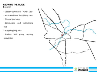 This document provides an analysis of Deccan Gymkhana, Pune's central business district. It summarizes the existing conditions, including land use, population density, transportation networks, and amenities. The analysis finds that while the area has many strengths like a mix of land uses and major institutions, it also faces issues like inadequate pedestrian infrastructure and parking. The document proposes short, medium, and long-term interventions to address these problems by creating a more connected pedestrian network, improving crossings, adding street furniture, and reconfiguring public spaces to accommodate future growth brought by a new metro rail project. The goal is to enhance mobility, accessibility, and quality of public spaces as the area undergoes significant changes.