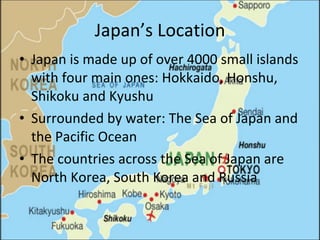 Japan is an island country made up of over 4000 small islands, with four main islands. Tokyo is the capital and largest city, with a population of over 126 million people. The Japanese currency is the yen. Japan has a culture that values politeness and respect. Popular aspects of Japanese culture include anime, manga, Mount Fuji, cherry blossoms, and traditions like visiting temples and shrines.