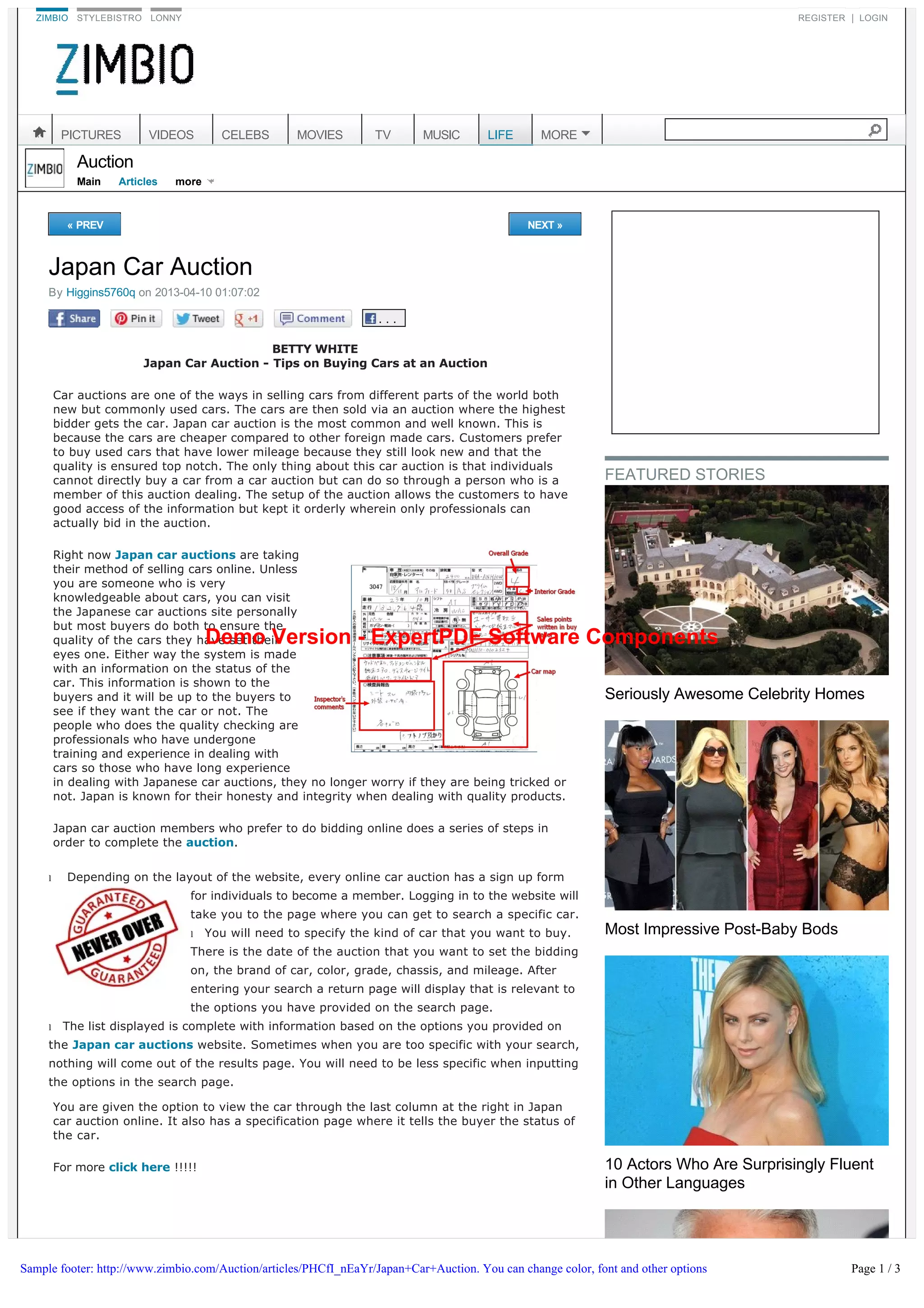 The document provides tips and information about buying cars from Japan car auctions. It explains that Japan car auctions are a common way to buy used cars from Japan that have low mileage and are of high quality at cheaper prices than other foreign cars. It describes the process for both attending auctions in person and bidding online as an auction member, including searching for vehicles, viewing details and specifications, and placing bids.
