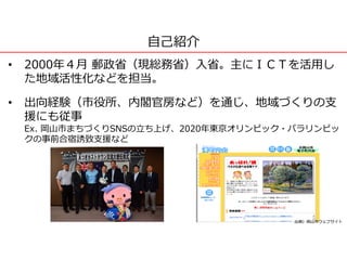 自己紹介 • 2000年4月 郵政省(現総務省)入省。主にICTを活用し た地域活性化などを担当。 •