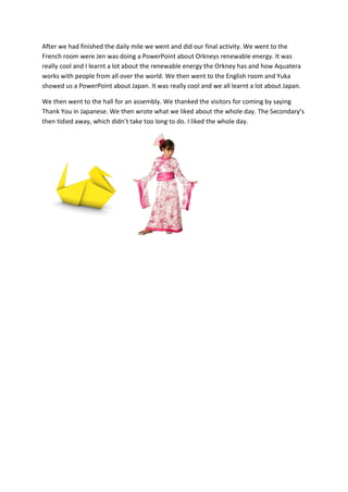 On a Japan Day at the school, two visitors from Ireland and Japan spoke to students about renewable energy. Students participated in various activities that taught them about Japanese culture, such as trying foods, composing music, origami, and haiku poetry. They also did a science experiment making hydrogen gas and saw a demonstration of a hydrogen-powered toy car. Presentations at the end of the day provided information about renewable energy in Orkney and an overview of Japan. The Japan Day was an engaging way for students to learn about Japanese culture and renewable energy.