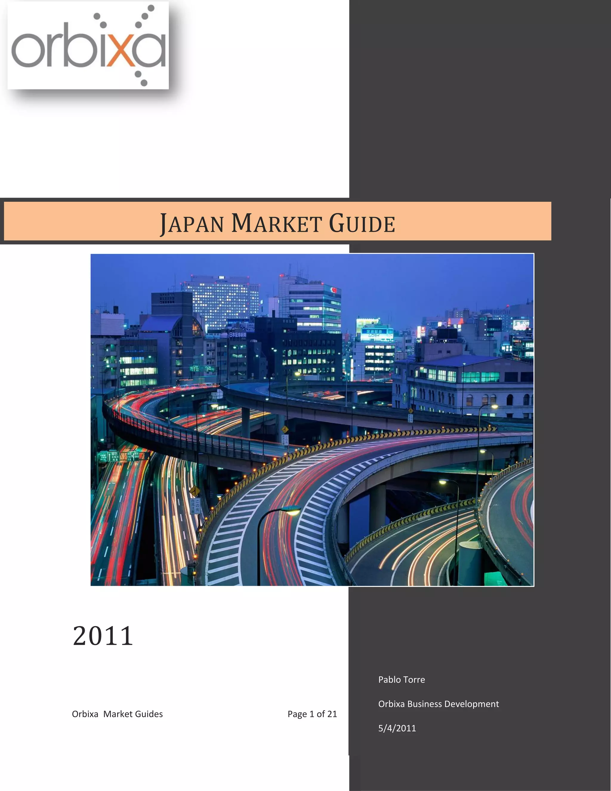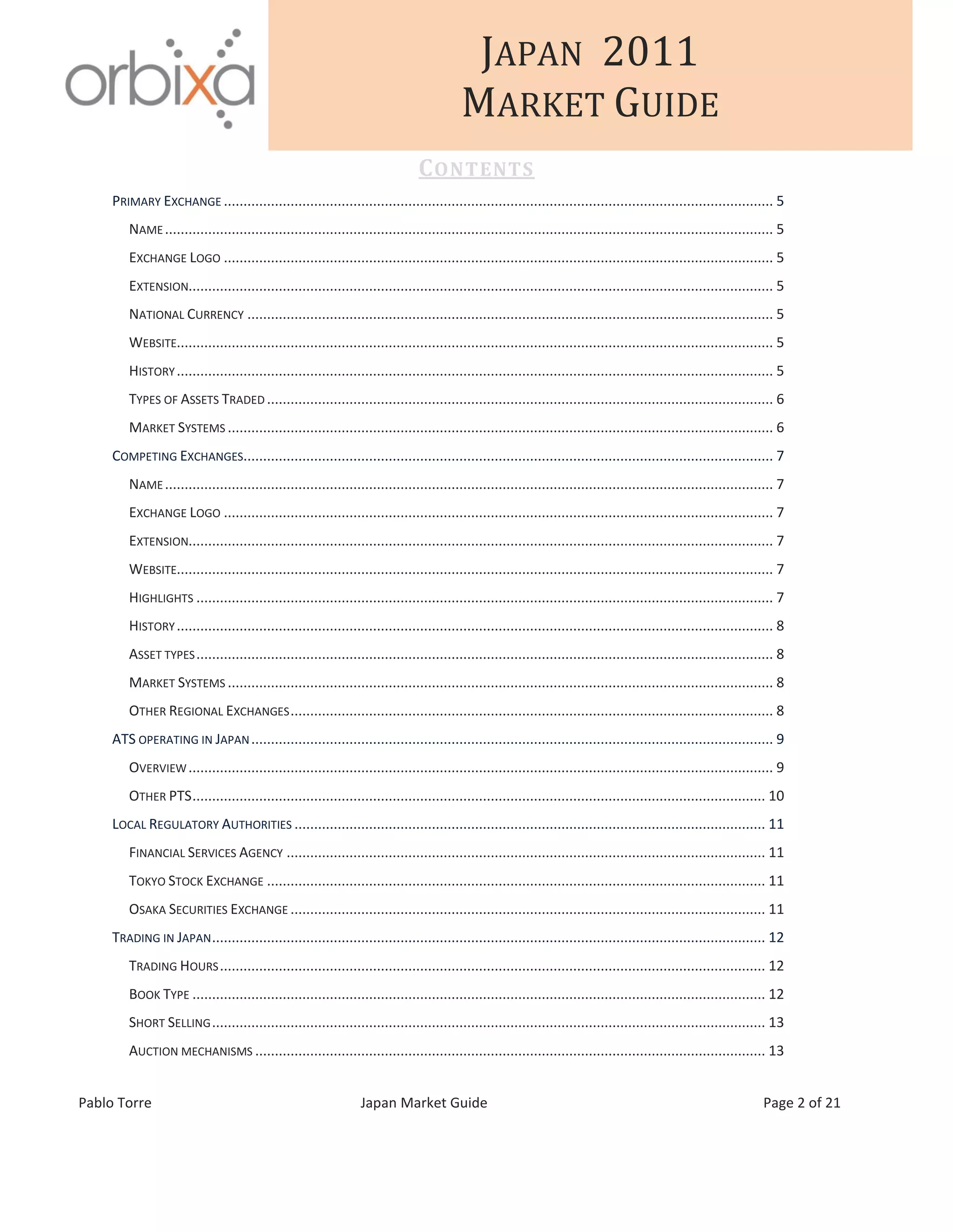 This document is a market guide for trading in Japan that provides information over 21 pages on the primary exchange, competing exchanges, alternative trading systems, regulatory authorities, how trading works, market indices, statistics, economic resources, news/research sources, and data sources for the Japanese market. It was last updated on May 4, 2011 by Pablo Torre of Orbixa Business Development and contains details on the Tokyo Stock Exchange, Osaka Securities Exchange, national currency, trading hours, order types, and how to get started trading in Japan.
