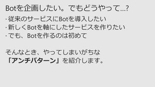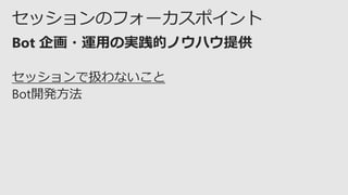 2017本情報の内容(添付文書、リンク先などを含む)は、Microsoft Tech Summit 2017 開催日(2017 年 11 月 8日 - 9 日)時点のものであり、予告なく変更される場合があります。 経験者が語る!Bot企画/運用のエッセンス ~ Bot framework + Azure の運用サイクル ~