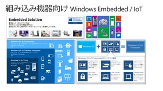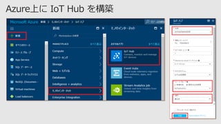 Azure) IoT Hub • 1千万台以上のデバイスの接続、管理 • 双方向通信の確立 • デバイスからのデータ受信 • デバイスに対するコマンド送信 • デバイスの登録、認証、管理 フィールド ゲートウェイ ローレベル センサー類 インテリジェント デバイス類 インターネット接続 AMQP/MQTT HTTPS プロトコル I/O通信 シリアル、Bluetooth、 USB など ローカルネットワーク通信 WiFi、Ethernet など インターネット接続 AMQP/MQTT HTTPS プロトコル IoT Hub 接続モジュール IoT Hub 接続モジュール IoT Hub 接続モジュール Azure IoT SDK Azure IoT Hubに容易に接続するための、 オープンソースライブラリ ・様々なOSに対応 (Windows, Linux, Arduino, mbed など) ・様々な開発言語に対応 (C, C#, Python, Node.js, Java など)