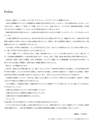 Preface 2012年、地球サミット2012(リオ+20)がブラジル、リオデジャネイロで開催されます。 10年に1度開催されているこの国連最大の会議は今回で3回目ですが、これまで、大きな成果は出ていません。そこ で私たちは、「参加」と「対話」と「行動」をキーワードに、未来へ向けて、どうすれば「持続可能な開発」を実現 できるのかをこの地球サミットをきっかけに世界に届けたいと考えています。 持続可能な世界を目指すために、いま舵を切る必要があるとはだれもが感じているでしょう。どうすればいいので しょうか。 この電子書籍が作られた日本では、2011年3月11日に大きな震災がありました。地震だけでなく、津波や原子力発 電所の事故など災害と人災により甚大な被害を受けました。同時に、原子力発電所の事故で、日本は世界に対して放 射能をばらまくという加害者にもなりました。 大きな悲しみや怒りが被災地を、そして日本を包みましたが、またそこに世界中からたくさんの祈りが集まりまし た。悲しみや怒りの中から前を向く人たちも現れました。 一方で「復興バブル」と呼ばれるほど、現在、被災地にはヒト、モノ、カネが吸い込まれています。例えば、カ ネ。日本政府は復興経費として約18兆円を投じます。これは、岩手、宮城、福島の被災3県の年間予算約7年分です。 自然災害、政府/市民との関係、お金、原発事故、エネルギー問題、そして環境問題。2011年3月11日を経て、日 本がいまもなお抱える問題は、世界が抱える問題の縮図でもありました。 例えば、人口問題があります。 2011年、世界人口は70億を超えました。驚くべきことですが、1800年代の世界人口は10億人。その130年後の1930 年で倍の20億に。そこから1974年に40億人、1987年には50億人、1999年に60億人に……加速する人口増加、予測で は2045年に世界人口は90億人に達すると言われています。1秒ごとにおよそ5人が生まれている計算です。 生活様式も変貌しています。日本では、都市へ人口が集中していますが、世界でもそれは同様で、2008年、人類史 上はじめて都市人口が農村人口を上回りました。 人口の増加と、生活様式の変化。急激な変わりように人と地球のバランスが悪くなっていると感じている人は多い のではないでしょうか。 人類の5%が世界のエネルギーの23%を消費しています。 人類の13%がきれいな飲料水を確保できないでいます。 人類の38%が十分な衛生設備を持っていません。 そして、今。 日本に暮らす人の声を集めることで私たちが目指す未来が浮かんできます。 ようやく気づきはじめた新しい未来の姿を失わないように、世界に届けることが人と地球のバランスを崩した経済 大国の責務であり、二度の原子爆弾投下と史上最悪の原発事故を経験した日本の役割だと信じています。