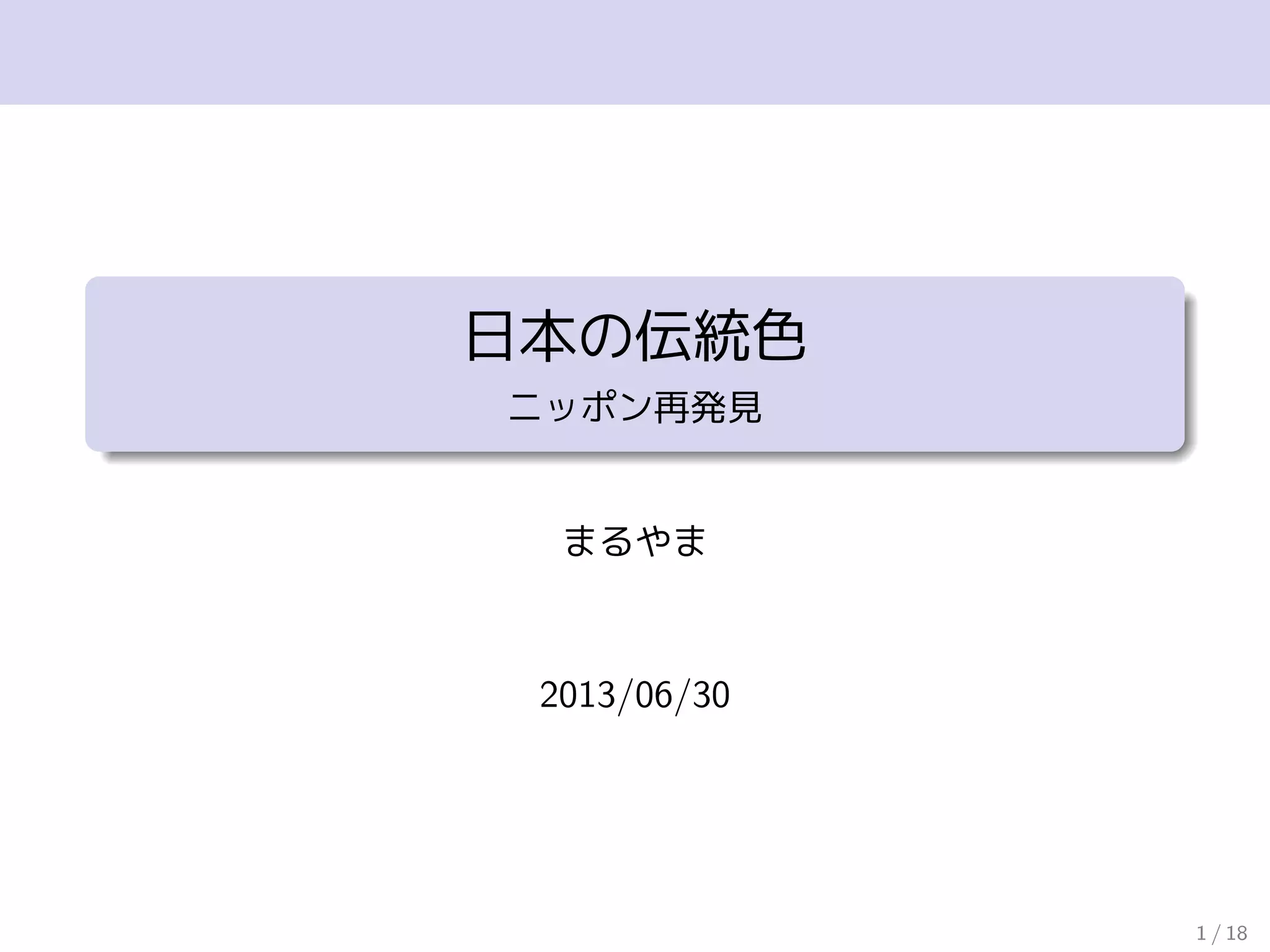 awk で変形して作っただけです なんでこんな事を? LATEX の色設定を勉強するため なんとなく なんの意味があるの? いっぱい色がある色鉛筆とか、好きじゃないですか キレイだなぁとか いっぱいあるなぁとか 日本の色の名前って面白いねとか そんな感じにお使いください 2 / 18
