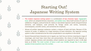 The modern Japanese writing system combines logographic kanji and syllabic kana, consisting of hiragana and katakana, creating a complex structure with thousands of kanji and two main phonetic scripts. Kanji represents most content words, while hiragana is used for grammatical elements and inflections, and katakana is reserved for foreign words and emphasis. Unique writing mechanisms such as jukujikun and ateji further illustrate the intricate nature of Japanese writing, as well as differences in sentence structure and grammar compared to English.