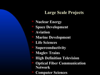 This document discusses Japan's current and future technology management challenges across various sectors. It outlines Japan's large-scale projects and research in areas like nuclear energy, space development, aviation, marine development, life sciences, and computer sciences. While Japan has had some successes, it also faces ongoing challenges with safety, cost, and developing breakthrough technologies to solve major problems. The document concludes by noting that Japan has established public and private business incubators, but the results have not been very encouraging so far.
