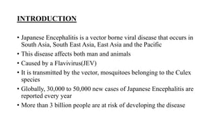 Japanese encephalitis is a mosquito-borne viral disease that is common in parts of Asia. It is transmitted to humans via bites from infected Culex mosquitoes. While most infections cause mild symptoms or no symptoms, approximately 1 in 250 infections result in encephalitis, which can be fatal in 30% of cases. Survivors often face permanent neurological impairments. Control efforts focus on vaccination programs and reducing mosquito populations in areas like rice paddies where they breed.