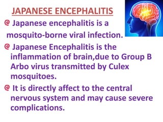 Japanese encephalitis is a mosquito-borne viral infection that causes inflammation of the brain. It is most common in parts of Asia including Japan, China, and India. The virus is transmitted via Culex mosquitoes and pigs and birds can act as reservoirs. Most cases occur in children under 15 years of age during the rainy season. Symptoms progress through prodromal, acute encephalitic, and late stages with high fever, seizures, unconsciousness, and potential long-term neurological impairment. Diagnosis involves detecting IgM antibodies or antigens in blood or CSF. Prevention focuses on vaccination programs and vector control like insecticides and larvivorous fish. Treatment involves fever control, anti-convulsants, and