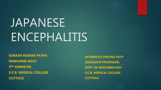 Japanese encephalitis (JE) is a mosquito-borne viral infection primarily affecting humans, horses, and pigs, with notable historical outbreaks in Japan and significant cases in tropical regions like India. The virus is transmitted mainly by the Culex tritaeniorhynchus mosquito, with pigs serving as amplifying hosts and birds as reservoirs. Current prevention focuses on vaccination, sanitary measures, and vector control, particularly in affected rural areas of India.