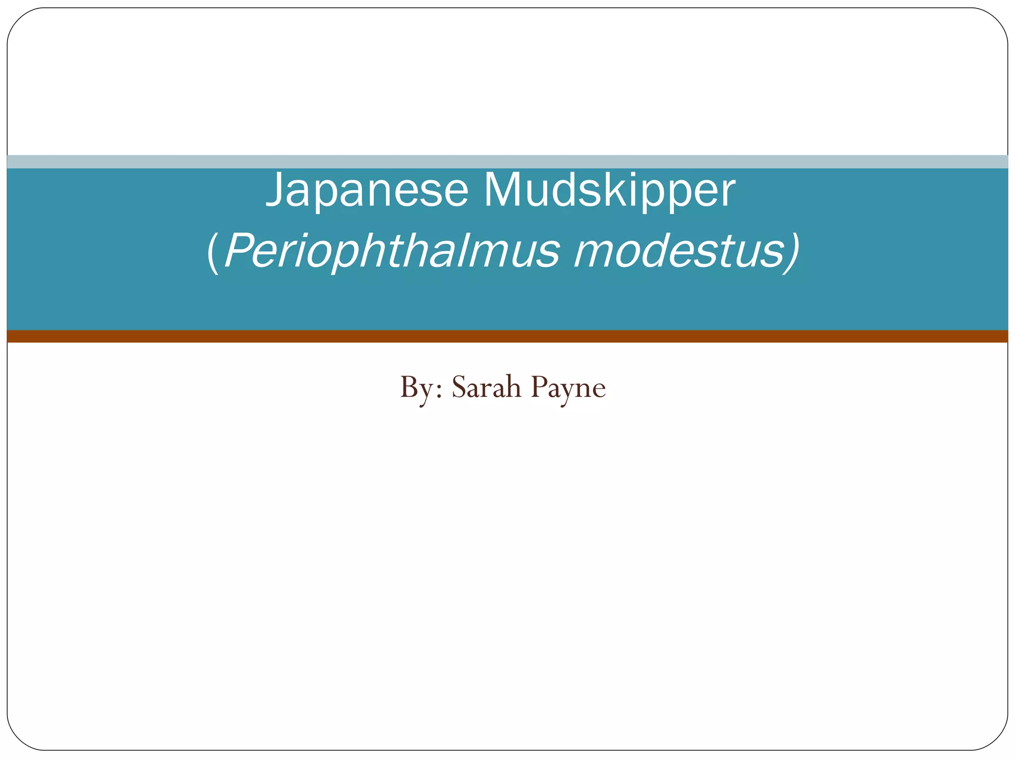 The Japanese mudskipper is a small fish that lives in burrows in mudflats and has several adaptations that allow it to survive both in and out of water. It is light brown or gray with white spots and has a whitish underside. It can breathe through its skin and mouth, stay out of water for over a day, and hear sounds out of water through an unknown organ. Males dig burrows and attract mates with behaviors like tail waving; they guard the eggs until the larvae hatch and disperse.