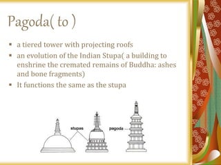 This document provides information about Japanese pagodas, including their origins, design, construction, and types. It notes that pagodas evolved from Indian stupas and were introduced to Japan from China. Pagodas emphasize verticality and symbolize the connection between earth and heaven. They are typically made of wood with tiered roofs and central columns. The document describes several famous Japanese pagodas and provides details on their construction, materials, and historical and religious significance. It also distinguishes between wooden and stone pagodas.