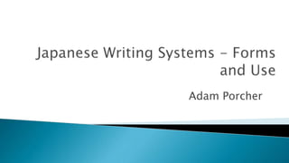 Modern Japanese utilizes four writing systems: kanji, hiragana, katakana, and romaji. Kanji, derived from Chinese characters, is used for nouns and verbs, while hiragana and katakana are phonetic alphabets, with hiragana often used for grammatical devices and katakana for foreign loanwords. Romaji represents Japanese phonetically using the Latin alphabet but is generally not recommended for fluent language use.