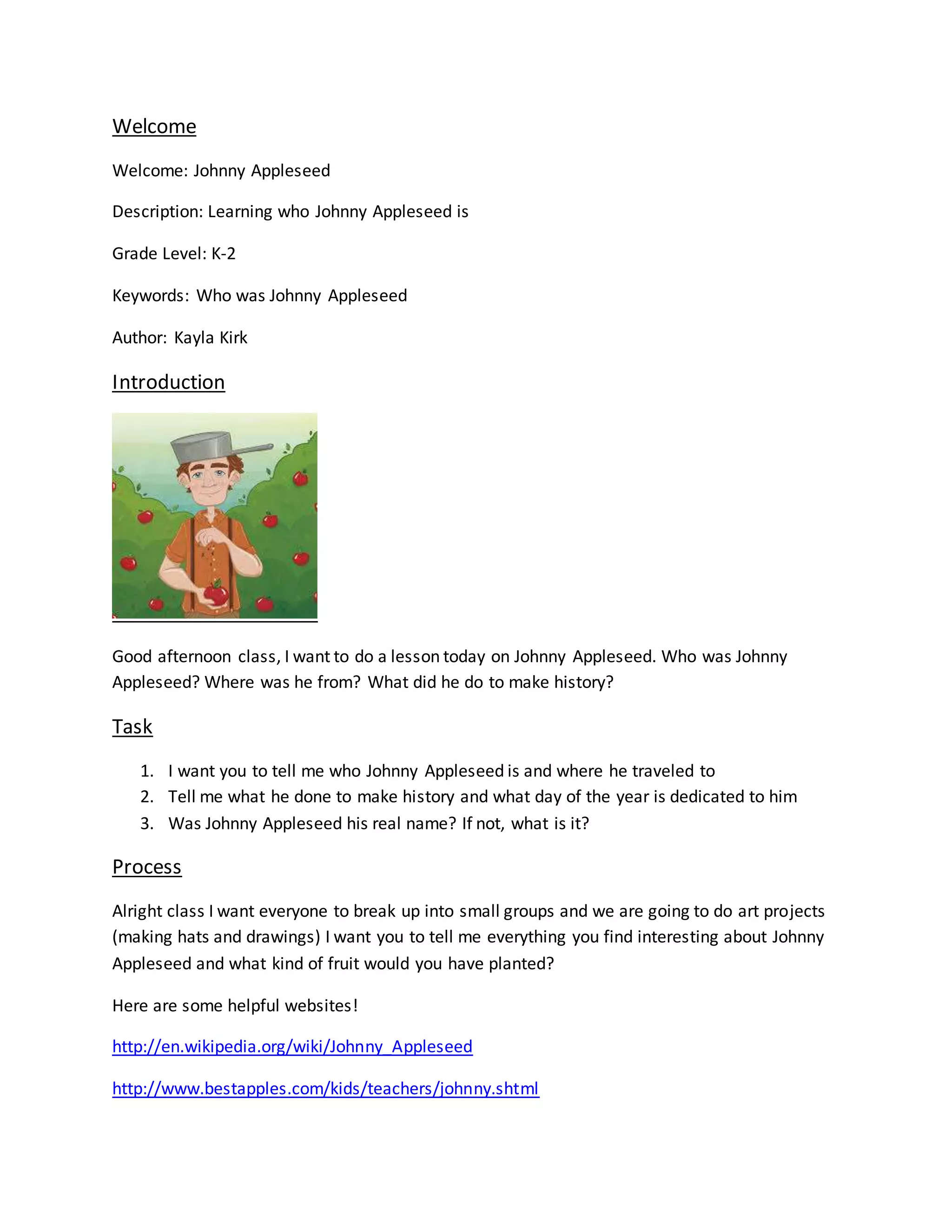 This document provides a lesson plan about Johnny Appleseed for grades K-2. It introduces Johnny Appleseed and asks students to learn facts about who he was, where he traveled, and what he did to make history. Students are instructed to break into groups and research Johnny Appleseed using provided websites, then share 3 facts and 2 interesting things they learned. They will complete coloring worksheets and make hats while reflecting on their opinion of Johnny Appleseed and rating their enjoyment of the assignment out of 10.