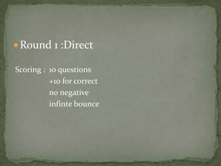 The document outlines a quiz competition held by the Jaipur Quiz Club, consisting of various rounds and questions on a wide range of topics including brands, historical figures, and popular culture. It features a mix of direct scoring and connect-the-dots questions, requiring participants to identify answers from clues provided. Notable questions reference figures such as Stephen Hawking and Christopher Columbus, as well as companies like Goodyear and Mozilla.