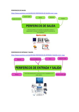 This document discusses the internal elements and peripherals of a personal computer. It includes sections on storage units, input peripherals, output peripherals, input/output peripherals, and the internal elements of the CPU. Each section provides a link to an online mind map with further details on that component of the computer.