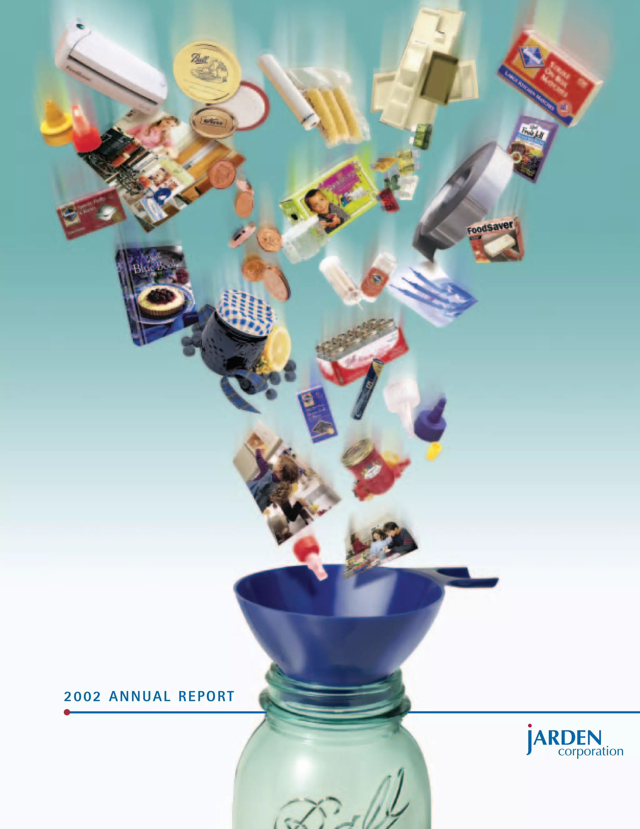 This document is Jarden Corporation's 2002 Annual Report. It provides an overview of the company's performance in 2002 including financial highlights and summaries of its main business segments: branded consumables, home vacuum packaging, plastic consumables, and other. It discusses the company's acquisition of Tilia and strategic direction to build a world-class consumer products company with leading market shares in niche branded consumable products.