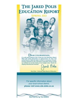 The Jared Polis Education Report Spring 2003 discusses the severe budget crisis faced by the St. Vrain School District, resulting in significant cuts including administrative positions and teacher pay. It highlights the impact of Colorado's economic downturn on education funding and mentions various initiatives aimed at providing educational support, including an interest-free loan to the district and online learning opportunities for students. The report also addresses upcoming ballot measures to amend state tax laws which affect school funding, as well as the rise of 'cyberstudents' benefiting from online courses.