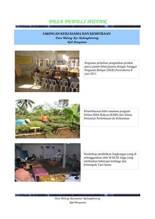 Dokumen ini menjelaskan tentang berbagai kegiatan kerjasama dan kemitraan Desa Melung dengan berbagai lembaga dalam rangka melestarikan hutan, seperti penanaman pohon, pelatihan pasca panen, pemeliharaan bibit tanaman, workshop lingkungan, serta kunjungan petani dari luar negeri untuk belajar sistem pertanian organik di Desa Melung.