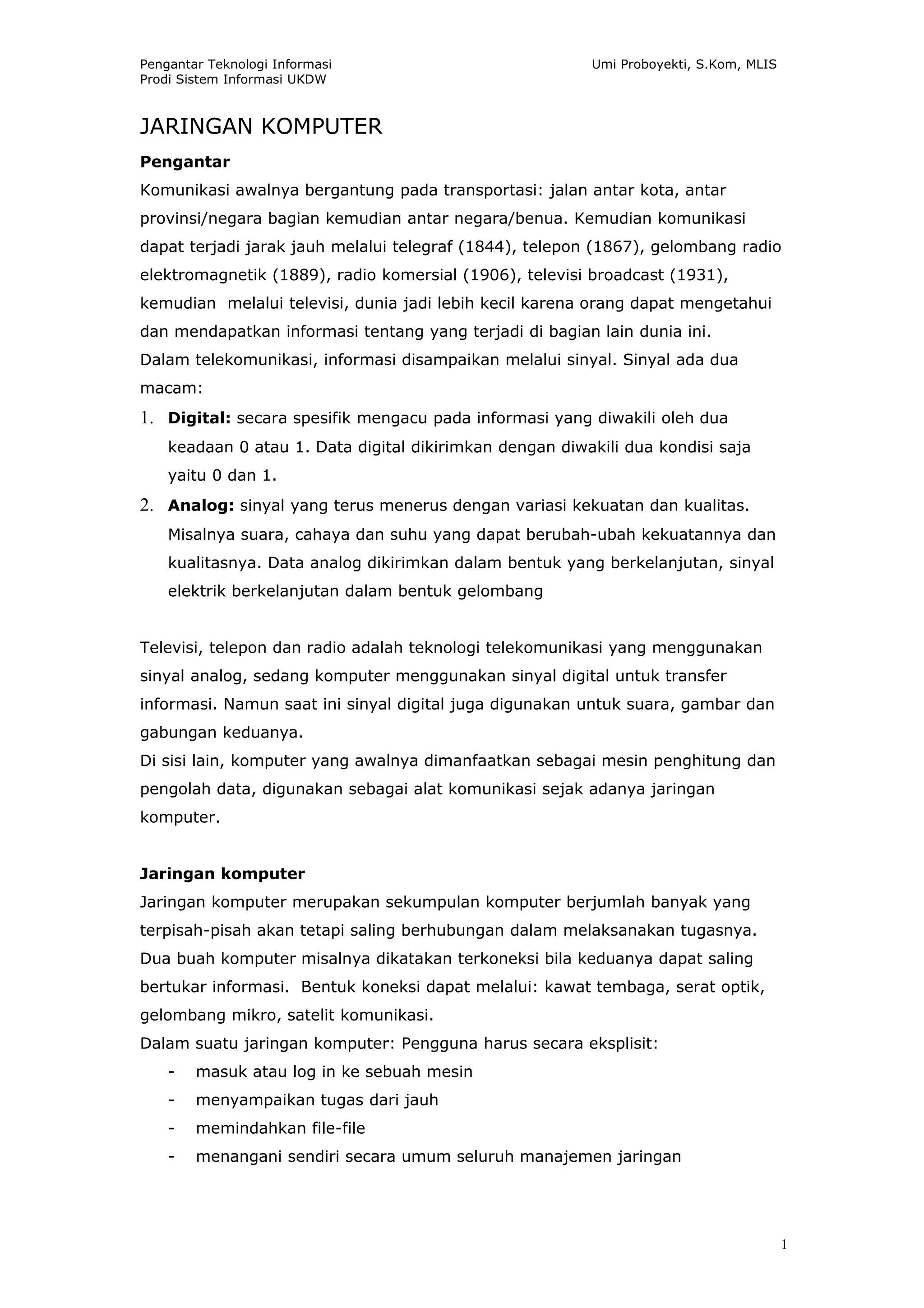 Dokumen ini membahas pengantar teknologi informasi dan jaringan komputer, menjelaskan perkembangan komunikasi dari transportasi tradisional hingga teknologi digital dan jaringan komputer yang memungkinkan pertukaran informasi. Berbagai klasifikasi jaringan dan protokol komunikasi juga dibahas, termasuk model referensi OSI dan TCP/IP. Jaringan komputer kini menjadi bagian penting dalam berbagai sektor, mendukung kebutuhan berbagi informasi dan pengolahan data.