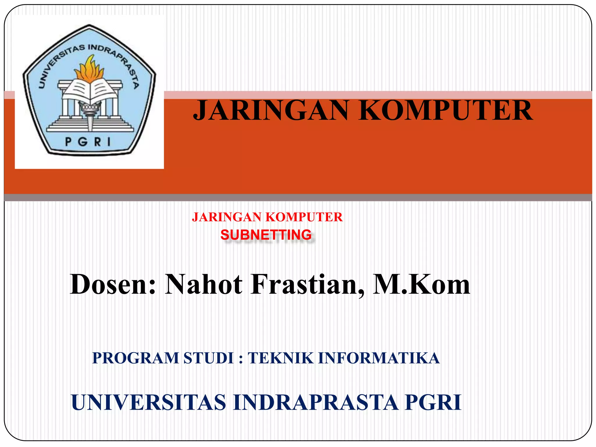 Dokumen ini menjelaskan tentang subnetting dalam jaringan komputer, termasuk pengelompokan jaringan besar menjadi jaringan kecil untuk meningkatkan performa dan keamanan. Proses subnetting melibatkan penghitungan bit untuk jumlah jaringan dan host yang diinginkan serta konversi ke format biner. Contoh penerapan subnetting juga diberikan, termasuk alokasi IP address melalui teknik yang dijelaskan.