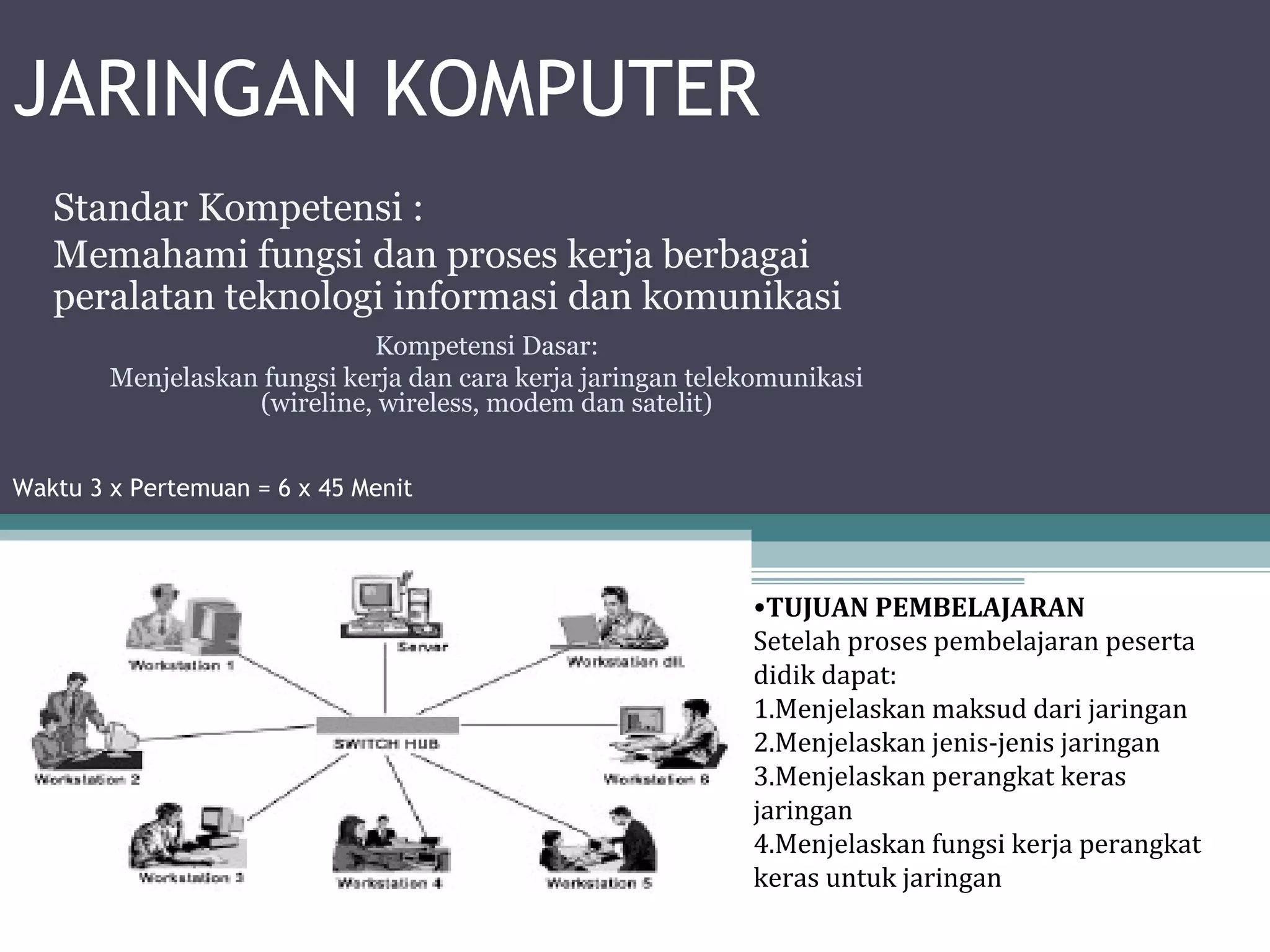 Dokumen ini membahas tentang standar kompetensi dan kompetensi dasar dalam memahami fungsi serta proses kerja jaringan komputer dan telekomunikasi. Terdapat penjelasan berbagai jenis jaringan, termasuk LAN, MAN, WAN, dan topologi jaringan seperti bus, star, mesh, dan ring serta karakteristik dari masing-masing. Juga terdapat keuntungan dan kelemahan dari jaringan mengunakan kabel (wireline) dan nirkabel (wireless).