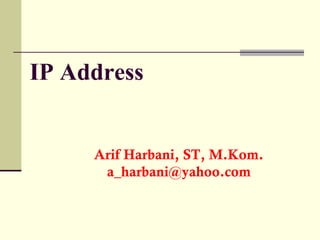 IP address adalah alamat unik yang digunakan untuk mengidentifikasi setiap host dalam jaringan TCP/IP, terdiri dari 32 bit dan dituliskan dalam 4 oktet desimal. Terdapat berbagai klasifikasi IP address, yaitu Kelas A, B, C, D, dan E, serta kategori seperti IP statis, dinamis, privat, dan publik. IP address juga diatur oleh pedoman tertentu, seperti RFC 1519 untuk distribusi IP dan memiliki alamat khusus seperti 0.0.0.0 untuk host baru yang diboot.