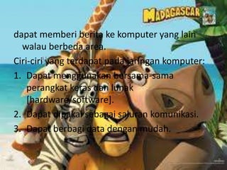 Jaringan komputer adalah sekumpulan komputer yang terhubung untuk berbagi informasi dan sumber daya. Jaringan ini bisa diklasifikasikan berdasarkan metode distribusi data, hubungan fungsional, dan jangkauan wilayah, seperti LAN, MAN, dan WAN. Manfaat dari jaringan komputer mencakup efisiensi berbagi sumber daya, integrasi data, dan peningkatan keamanan data.