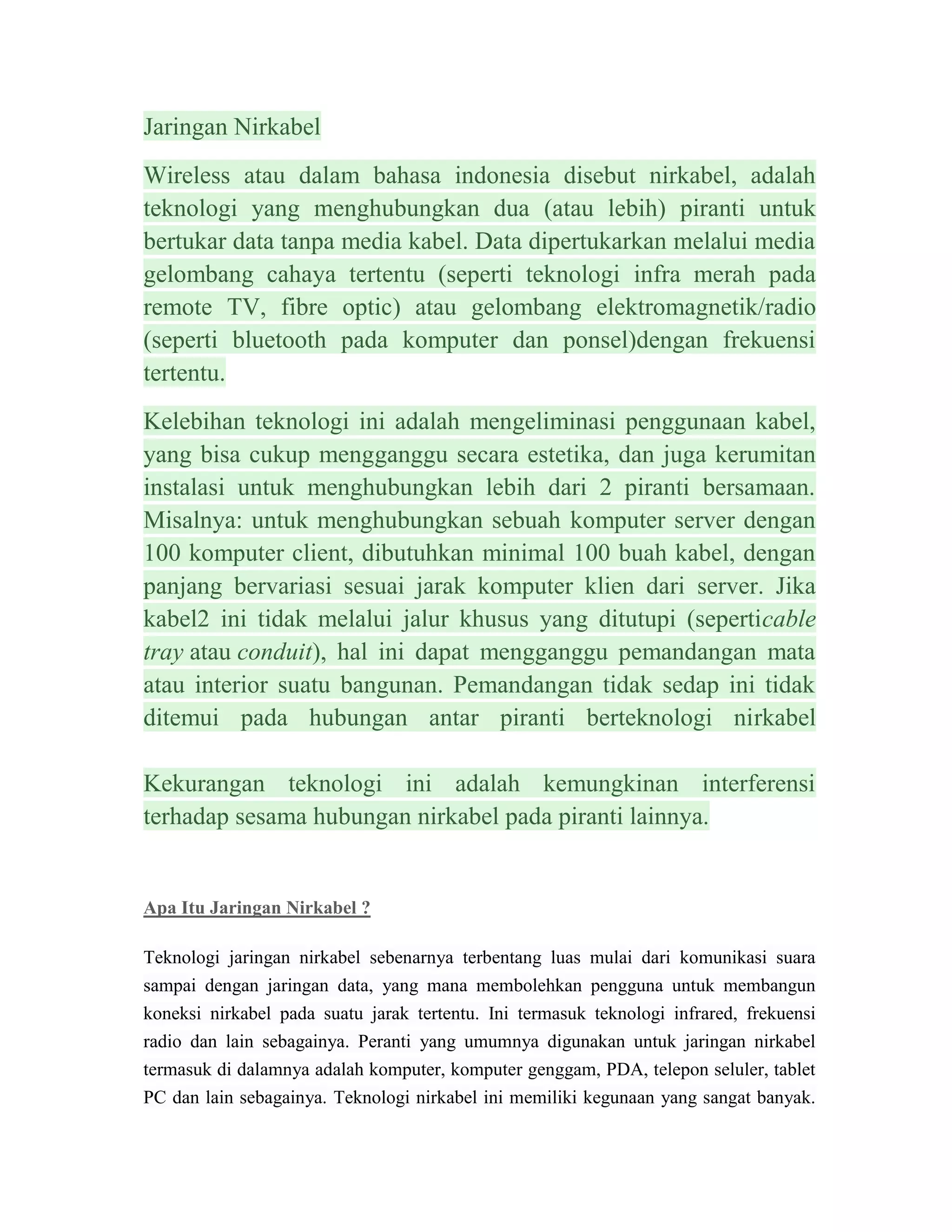 Teknologi jaringan nirkabel memungkinkan pertukaran data antar perangkat tanpa menggunakan kabel. Ada beberapa jenis jaringan nirkabel berdasarkan jarak cakupannya, seperti WLAN untuk area lokal, WMAN untuk area metropolitan, dan WWAN untuk area luas. Standarisasi diperlukan untuk memastikan kompatibilitas dan adopsi teknologi nirkabel.