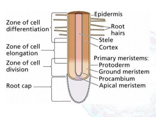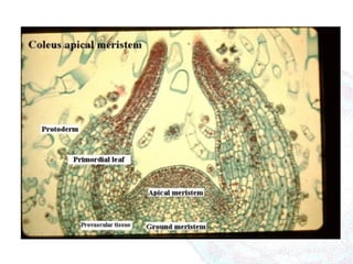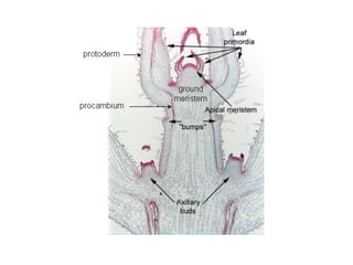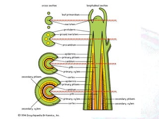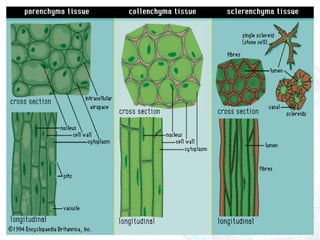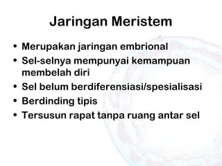 Jaringan tumbuhan terdiri dari jaringan meristem, yang bersifat embrional dan dapat membelah diri, serta jaringan permanen yang tersusun dari sel-sel dewasa yang telah berdiferensiasi. Meristem primer terletak di ujung akar dan batang, sedangkan meristem sekunder berasal dari jaringan dewasa dan menyebabkan pertumbuhan sekunder. Jaringan permanen mencakup jaringan pelindung, jaringan dasar, dan jaringan pembuluh, yang terdiri dari xilem dan floem untuk transportasi air dan senyawa organik.