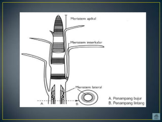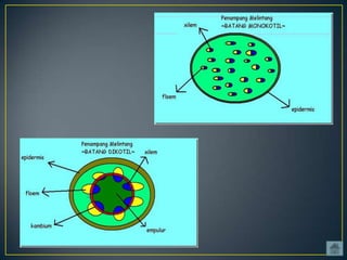 Dokumen ini membahas tentang jaringan tumbuhan, mencakup jenis-jenis jaringan meristem, jaringan permanen, dan struktur organ tumbuhan seperti akar, batang, daun, dan bunga. Jaringan meristem terbagi menjadi meristem apikal, interkalar, dan lateral yang berfungsi dalam pertumbuhan tumbuhan, sedangkan jaringan permanen telah mengalami diferensiasi. Selain itu, dijelaskan juga mengenai jaringan pengangkut dan sekretoris yang penting bagi fungsi kehidupan tumbuhan.
