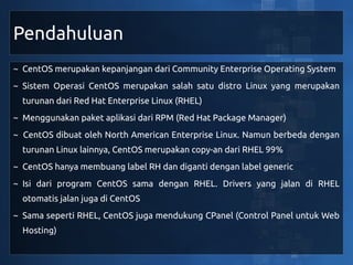 Dokumen ini menjelaskan tentang sistem operasi CentOS 6, yang merupakan turunan dari Red Hat Enterprise Linux (RHEL) dan menawarkan berbagai fitur aplikasi server seperti database, web server, dan mail server. Selain itu, dokumen ini juga mencakup kelebihan, kekurangan, dan aplikasi yang dapat digunakan untuk berbagai layanan di CentOS 6. Beberapa fitur utama termasuk virtualisasi, backup, dan kemampuan enkripsi.