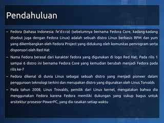 Dokumen tersebut merupakan pengantar sistem operasi Fedora 16 yang mencakup pendahuluan tentang Fedora serta panduan sistem administrasinya. Fedora adalah distro Linux berbasis RPM yang dikembangkan oleh Fedora Project dan didukung Red Hat, serta dikenal sebagai distro yang menggunakan teknologi terkini. Dokumen ini juga menjelaskan fitur-fitur layanan server dan aplikasi pendukungnya pada Fedora 16 seperti package management, jaringan, DNS, web server