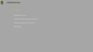 Dokumen tersebut membahas tentang layer data link (link layer) pada model OSI, khususnya mengenai protokol akses media, protokol partisi saluran, protokol akses acak, dan Ethernet. Beberapa poin penting yang dijelaskan antara lain penggunaan protokol CSMA/CD pada Ethernet, perbedaan antara protokol partisi saluran dan akses acak, serta fungsi dan komponen Ethernet dalam mengelola lalu lintas jaringan lokal.