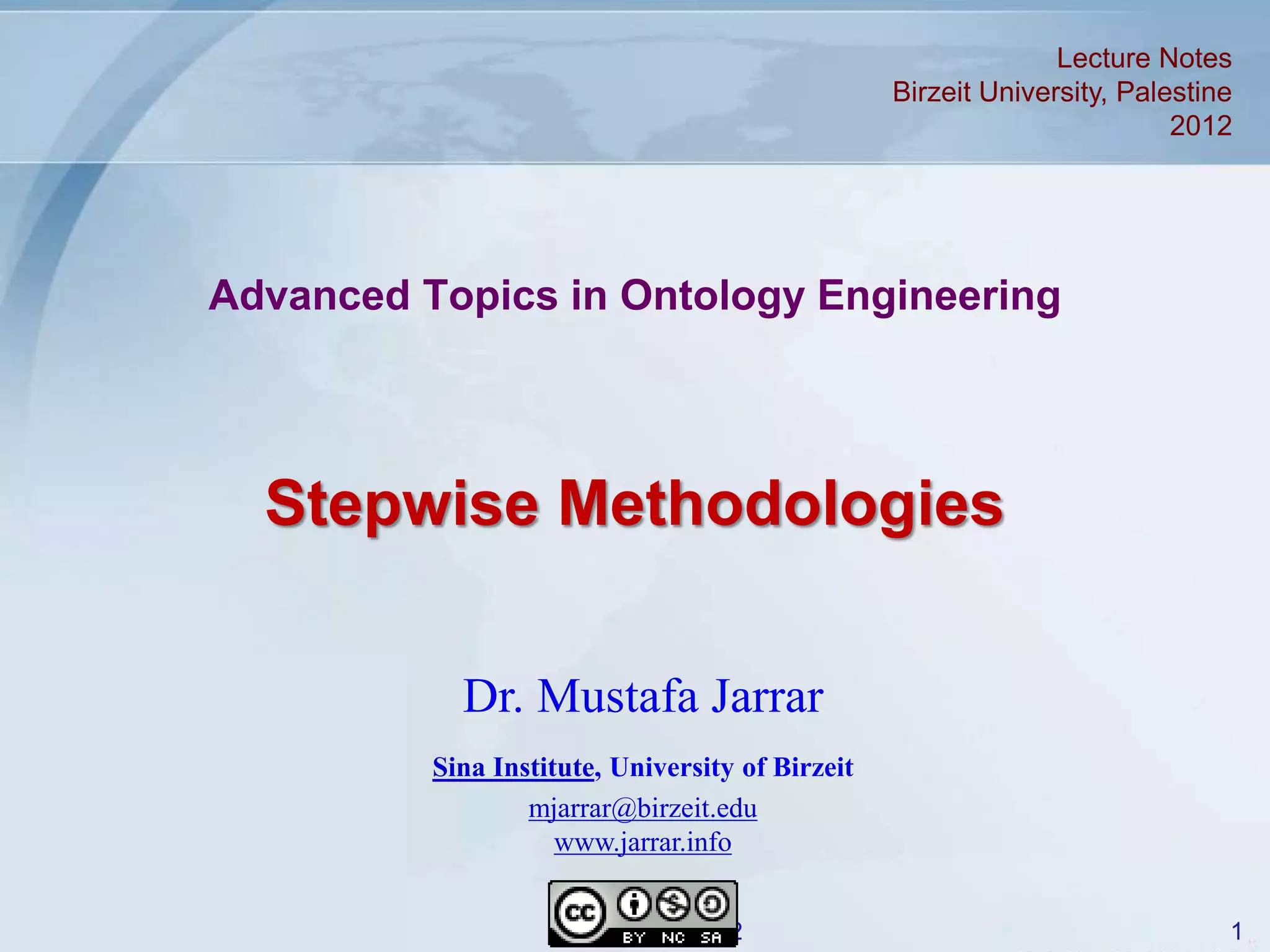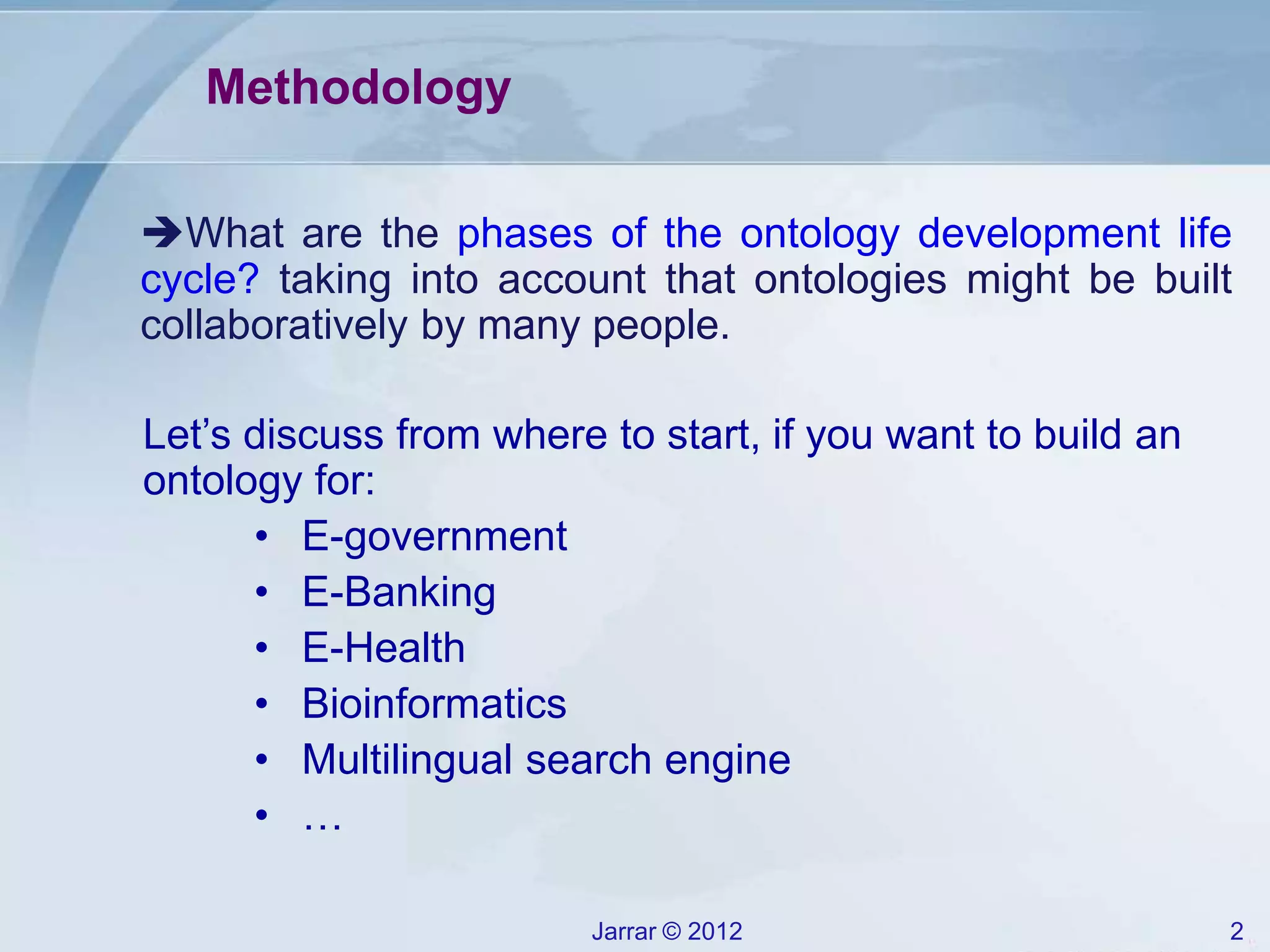 This document discusses methodologies for developing ontologies. It outlines common phases in ontology development including identifying purpose and scope, building the ontology through capturing concepts and relationships and formalizing the ontology, integrating existing ontologies, evaluating the ontology, and documenting it. Key aspects of each phase are described, such as determining the domain, intended uses, relevant concepts and properties, and relationships between concepts. The document emphasizes that the methodology should be tailored to each ontology's unique domain and purpose.