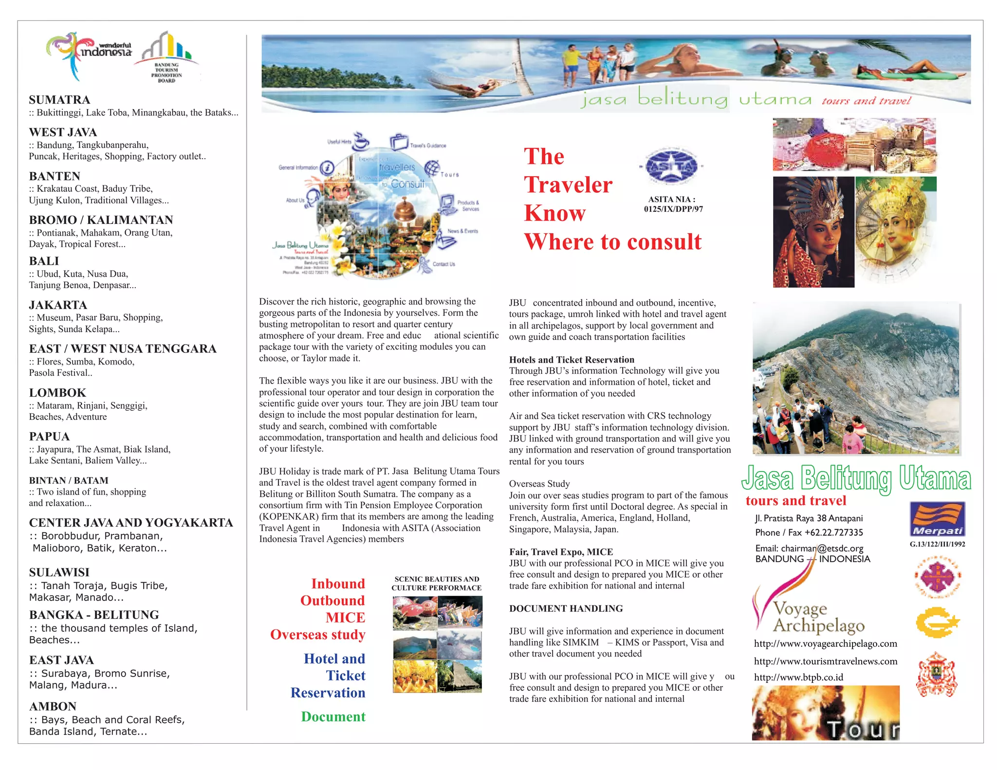 This document provides an overview of tourism destinations and services offered throughout Indonesia. It describes popular areas to visit in each of Indonesia's provinces, including Sumatra, West Java, Banten, Bromo/Kalimantan, Bali, Jakarta, East/West Nusa Tenggara, Lombok, Papua, Bintan/Batam, Central Java and Yogyakarta, Sulawesi, Bangka-Belitung, East Java, and Ambon. It also outlines the inbound and outbound tour packages, hotel and ticket reservations, overseas study programs, meetings, incentives, conferences and exhibitions services, and document handling services provided by PT. Jasa Belitung Utama