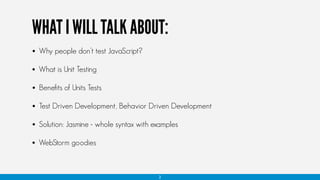 Unit testing JavaScript code with Jasmine allows developers to test functionality in isolation through matchers, spies, and asynchronous handling. Key benefits include cheaper QA, better documentation, improved code quality, and easier debugging. While some are deterred by complex asynchronous code or small projects, unit testing pays off through early bug detection and confidence that features work as intended.