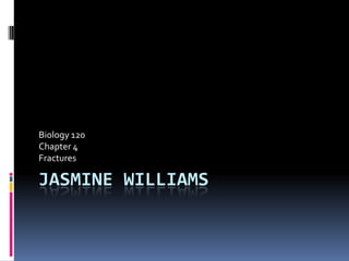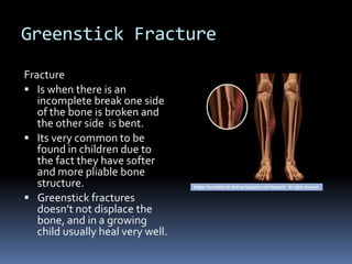 A greenstick fracture occurs when one side of a bone breaks while the other side bends, which is common in children due to their softer bone structure. A compression fracture happens when a vertebra is squished, often caused by osteoporosis in older individuals. A spiral fracture is when the break spirals around the bone shaft and heals more slowly, typically resulting from a twisting injury. Typical signs of fractures include pain, swelling, bruising, and discoloration, and they are usually treated through surgery, casting, or implants along with rehabilitation.