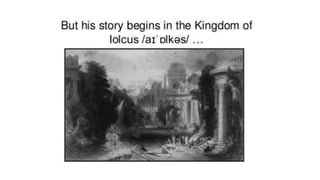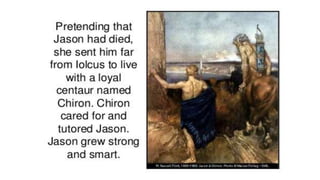 Jason was the rightful heir to the throne of Iolcus, but his uncle Pelias seized power and imprisoned Jason's father. When Jason grew up, Pelias agreed to relinquish the throne if Jason retrieved the Golden Fleece from the faraway land of Colchis. Jason assembled a crew called the Argonauts and sailed on the Argo, facing many dangers along the way. In Colchis, Jason fell in love with Medea who helped him defeat challenges and retrieve the Fleece, but they were forced to flee due to Medea's betrayal of her father the king. Back in Iolcus, Medea tricked Pelias' daughters into killing their father, so Jason and Medea left