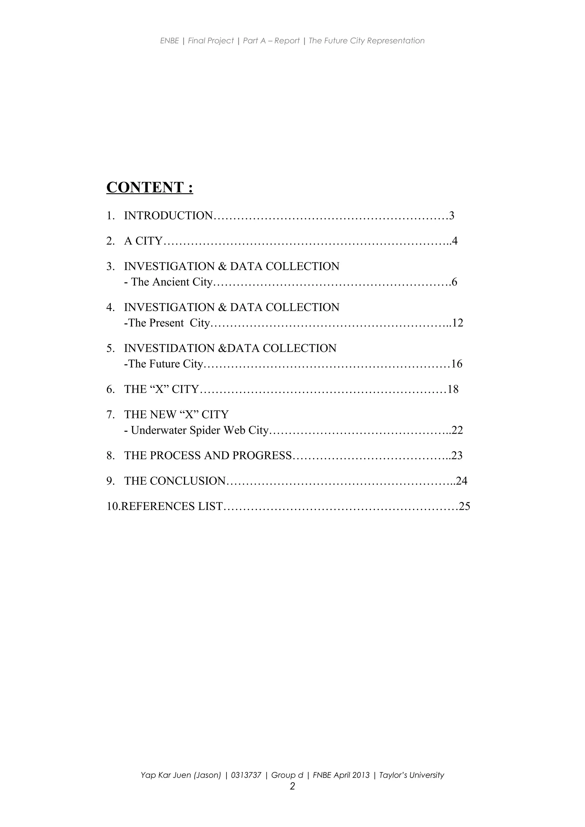 The document describes a student project to propose a new layout for a future city called "X City". It provides background information on what constitutes a city historically and currently. It also summarizes details about ancient cities like the Forbidden City in China and aspects of modern cities like Hong Kong that could inspire elements of the new future city design. These include palace doors with lucky number studs, long pathways, underground trams, and convenient stores. The goal is to design a sustainable and livable city for 150,000-500,000 Malaysian citizens using different types of city infrastructure.