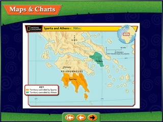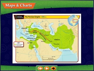The document provides an overview of several sections in a chapter about Ancient Greece. It summarizes the key points about the early Greeks, the development of Sparta and Athens as city-states, and Persia's attacks on Greece. It describes the geography of Greece, the rise and fall of the Minoan and Mycenaean civilizations, the influence of tyrants and the establishment of democracy in Athens. It also outlines the expansion of the Persian Empire and the Greek victories over Persia at Marathon, Thermopylae and Salamis that prevented their conquest.