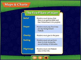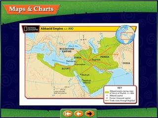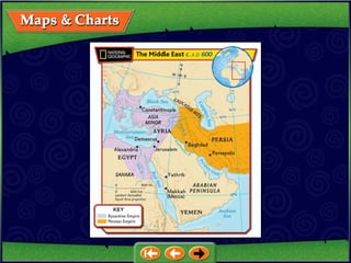 This document provides an overview of the content covered in a chapter on Islamic Civilization, including the rise of Islam, the spread of Islamic empires, and Muslim ways of life. The chapter introduction lists the main section titles and learning objectives. It then previews the content that will be covered in each section, such as the life of the prophet Muhammad, the establishment of Islamic empires in various regions, and the achievements and influences of these empires.