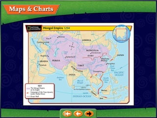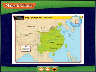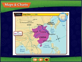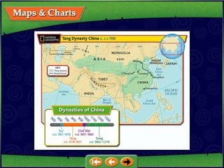 The document provides an overview of the key sections and content in a chapter about China in the Middle Ages. It discusses how China was reunited under dynasties like the Sui and Tang, and how society advanced with developments in agriculture, trade, technology, and culture during this period. Specific rulers, reforms, and the spread of Buddhism are also summarized. Review questions are provided to help students understand the material.