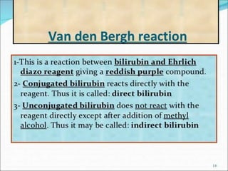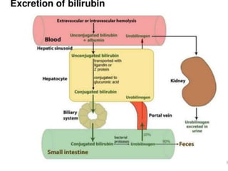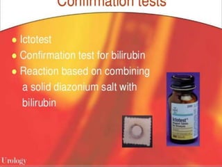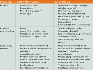 This document discusses jaundice, including its signs, stages, causes, differential diagnosis, and approach. Jaundice is a yellowish discoloration of the skin and eyes caused by high bilirubin levels. It is often a sign of liver disease or hemolytic disorders. The document outlines the sequential sites of jaundice, metabolism of bilirubin, measurement of bilirubin levels, differential diagnosis between liver diseases and bile duct disorders, and three patient cases presenting with different causes of jaundice.