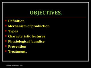 This document provides an overview of jaundice, including its definition, causes, types, and characteristics. Jaundice is caused by an increase in bilirubin levels and results in a yellowish discoloration of the skin and eyes. There are three main types of jaundice - hemolytic, hepatocellular, and cholestatic. The document describes the mechanisms, clinical features, and diagnostic tests for each type in detail. Physiological jaundice in newborns is also discussed. Treatment focuses on phototherapy for neonatal jaundice and addressing the underlying cause for pathological jaundice in adults.