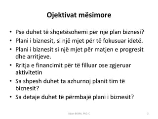 • Një plan biznesi përcakton objektivat tuaja, vlerësimet dhe