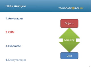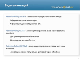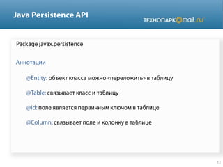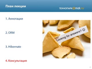 Документ представляет собой технический обзор различных аспектов языка программирования Java, включая аннотации, управление сессиями с использованием Hibernate, основы многопоточности, обработку исключений и работу с базами данных через JDBC. В нем перечислены ключевые особенности, такие как классы, типы данных, коллекции и принципы работы игрового сервера. Также рассматриваются вопросы сериализации, подписки на события и структура сообщений в системах.