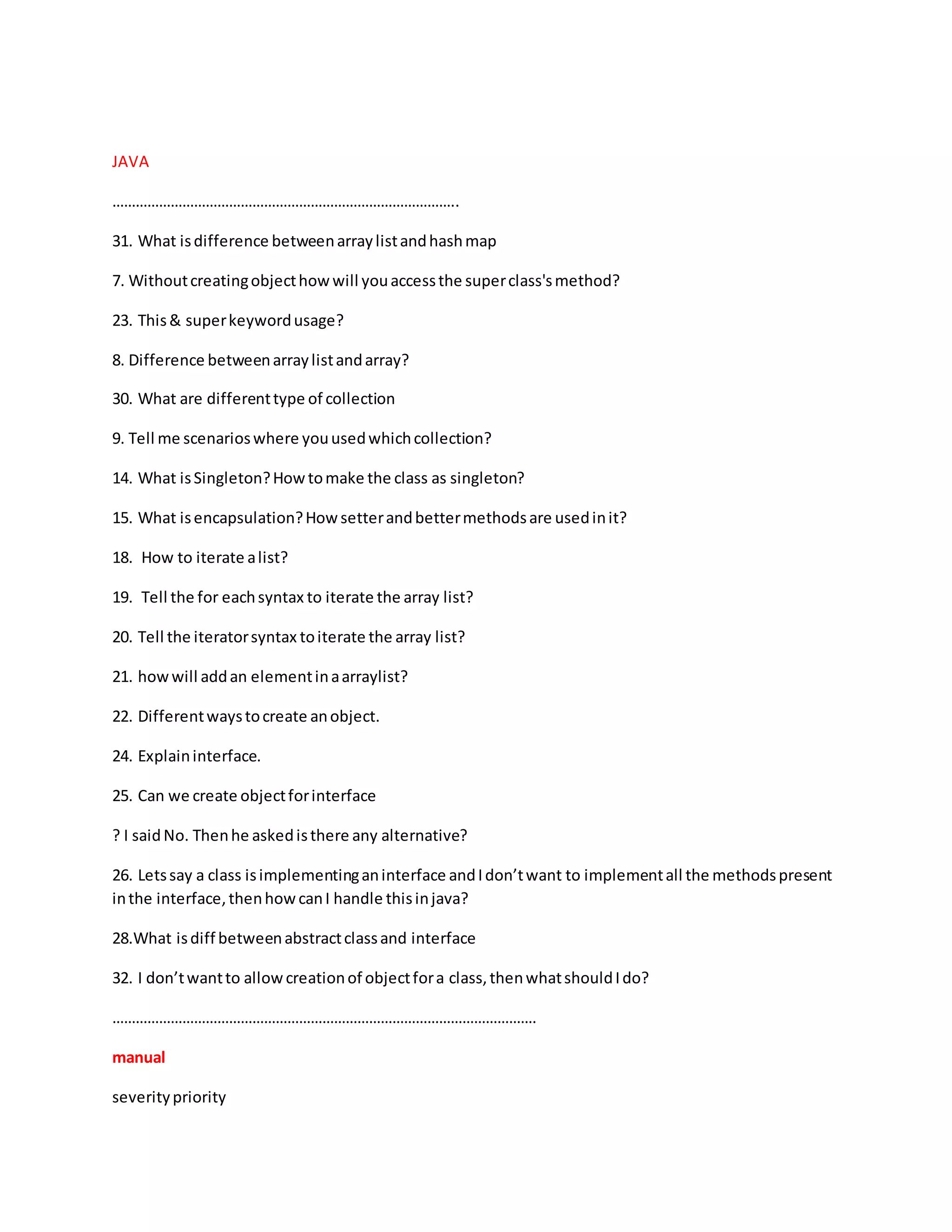 This document contains a list of questions related to Java, Selenium, testing concepts, and frameworks. It includes questions about collections in Java like ArrayList and HashMap, OOP concepts like inheritance and abstraction, design patterns like Singleton and Factory, testing frameworks like TestNG, and automation tools like Selenium. Specific questions cover page object model, locators, waits, exceptions, and reporting. The document demonstrates the wide range of topics that may be covered in a Java/Selenium interview.