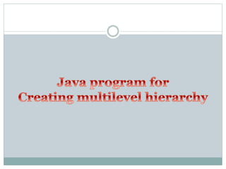 This document discusses multilevel hierarchies in Java inheritance. It defines inheritance as a mechanism that allows a subclass to extend a superclass, allowing for hierarchical classification. It explains that a multilevel hierarchy involves multiple layers of inheritance, where a subclass can be used as a superclass for another subclass. An example program is referenced to clearly demonstrate a multilevel hierarchy structure.